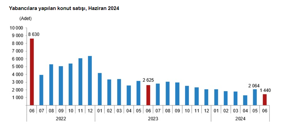 Yabancılara gerçekleştirilen konut satışları Haziran'da bir önceki senenin aynı ayına göre yüzde 45,1 azaldı ve bin 440 oldu. Haziran'da toplam konut satışları içinde yabancılara yapılan konut satışının payı yüzde 1,8 şeklinde gerçekleşti. Yabancılara gerçekleştirilen konut satış sayısının en fazla olduğu şehirler sırasıyla 593 ile Antalya, 478 ile İstanbul ve 116 ile Mersin oldu.