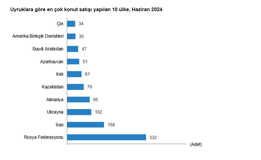Haziran'da ülke uyruklarına göre en fazla konut satışı sırasıyla 332 ile Rusya Federasyonu, 156 ile İran ve 102 ile Ukrayna vatandaşlarına gerçekleştirildi.