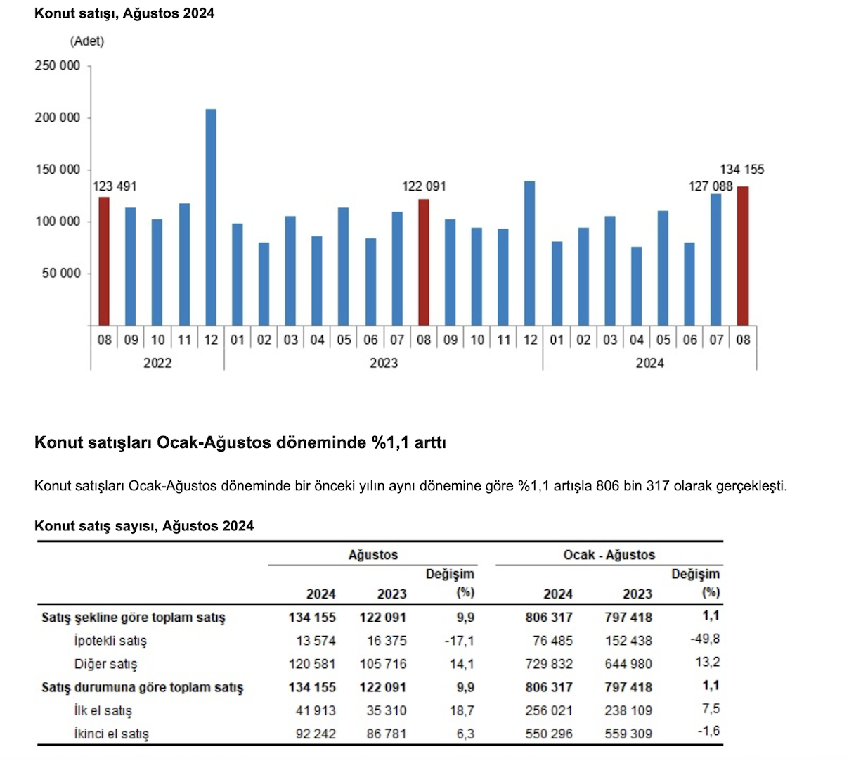Türkiye İstatistik Kurumu tarafından açıklanan rakamlara göre Türkiye genelinde konut satışları Ağustos ayında bir önceki yılın aynı ayına göre %9,9 artarak 134 bin 155 oldu.