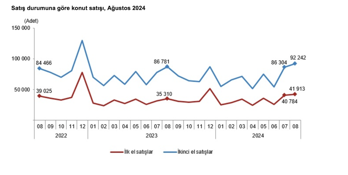 TÜİK rakamlarına göre ülke genelinde ikinci el konut satışları Ağustos ayında bir önceki senenin aynı ayına göre yüzde 6,3 artış göstererek 92 bin 242 oldu. Toplam konut satışları içinde 2. el konut satışının payı yüzde 68,8 şeklinde oldu. 2. el konut satışları Ocak-Ağustos döneminde ise bir önceki senenin aynı dönemine göre yüzde 1,6 azalışla 550 bin 296 şeklinde gerçekleşti.