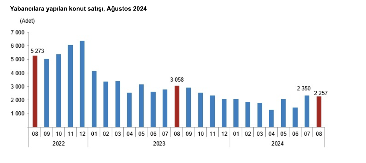 Yabancılara gerçekleştirilen konut satışları Ocak-Ağustos döneminde ise bir önceki yılın aynı dönemine göre yüzde 40,0 azaldı ve 15 bin 68 oldu Ülke uyruklarına göre en çok konut satışı Rusya Federasyonu vatandaşlarına gerçekleştirildi.