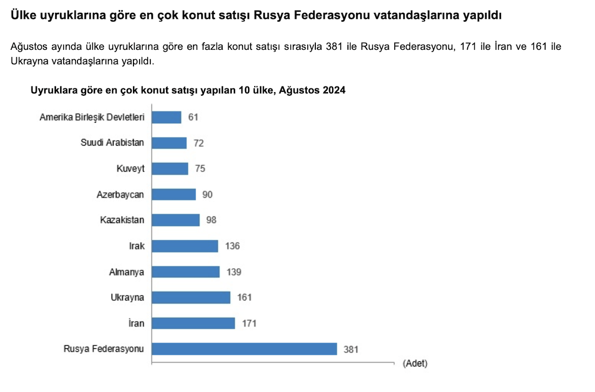 Bu ay ülke uyruklarına göre en fazla konut satışı sırasıyla 381 ile Rusya Federasyonu, 171 ile İran ve 161 ile Ukrayna vatandaşlarına gerçekleştirildi.