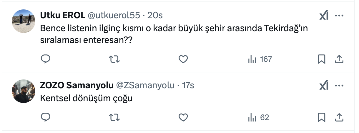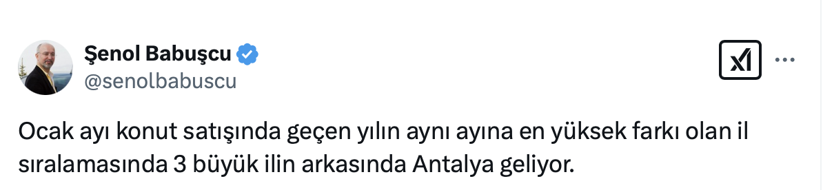 Şenol Babuşcu’nun yaptığı paylaşımda Ocak ayı konut satışında geçen yılın aynı ayına en yüksek farkı olan il sıralamasında 3 büyük ilin arkasında Antalya geldiğini belirtti.