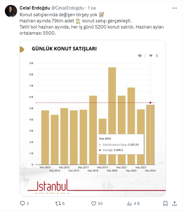 Erdoğdu, sosyal medya hesabı X'ten yaptığı açıklamada; tatili bol haziran ayında her iş günü 5 bin 200 konut satıldığını söyleyerek, haziran aylarının ortalamasının 5 bin 500 olduğunu açıkladı. İşte Erdoğdu'nun o paylaşımı ve gelen yorumlar...
