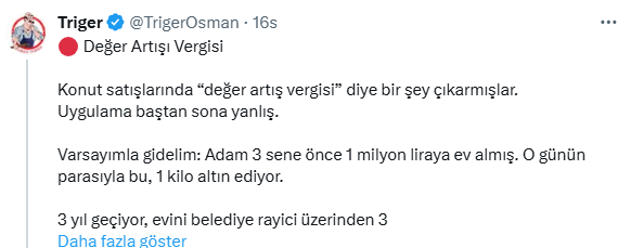 Konut satışlarında uygulanan vergi sistemi, vatandaşları zor durumda bırakıyor. Değer artış vergilerinin vatandaşı cezalandırdığını söyleyen 169,3 bin takipçili Triger Osman X sosyal medya hesabından vergi reformu önerisinde bulundu.