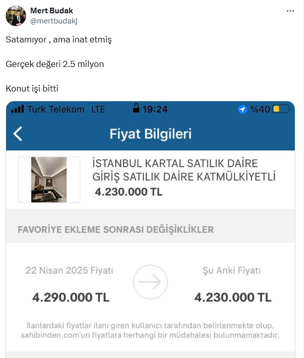 Girişimci Mert Budak, sosyal medya hesabından bu emlak ilanını paylaşarak, gerçek değerinin çok üzerinde satıldığını bundan alcısı olmadığını söyledi.