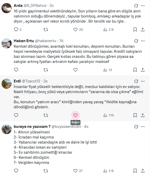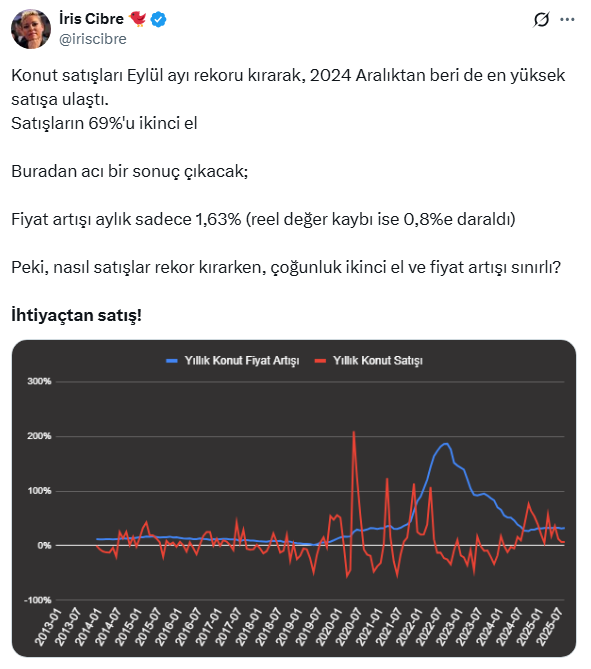 Ekonomist İris Cibre, TÜİK'in açıkladığı verileri değerlendirerek, ikinci el konut satışlarındaki artışa dikkat çekti. Satışlarda 'Acı sonuç' ifadesini kullanan Cibre, ikinci el konut satışlarının yüzde 69'a yükseldiğini söyledi.