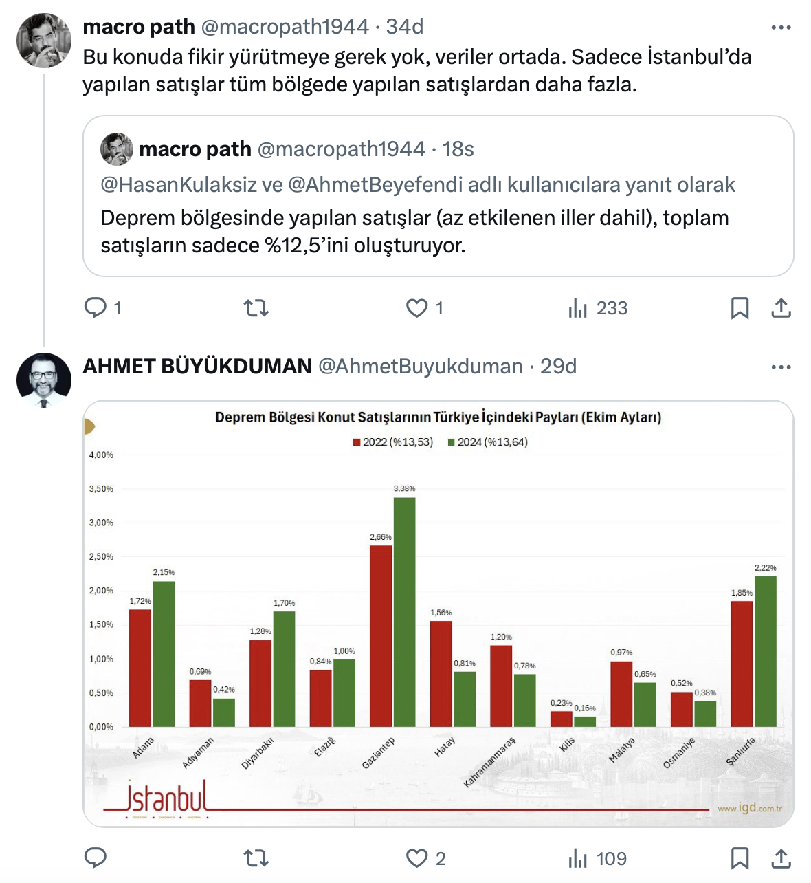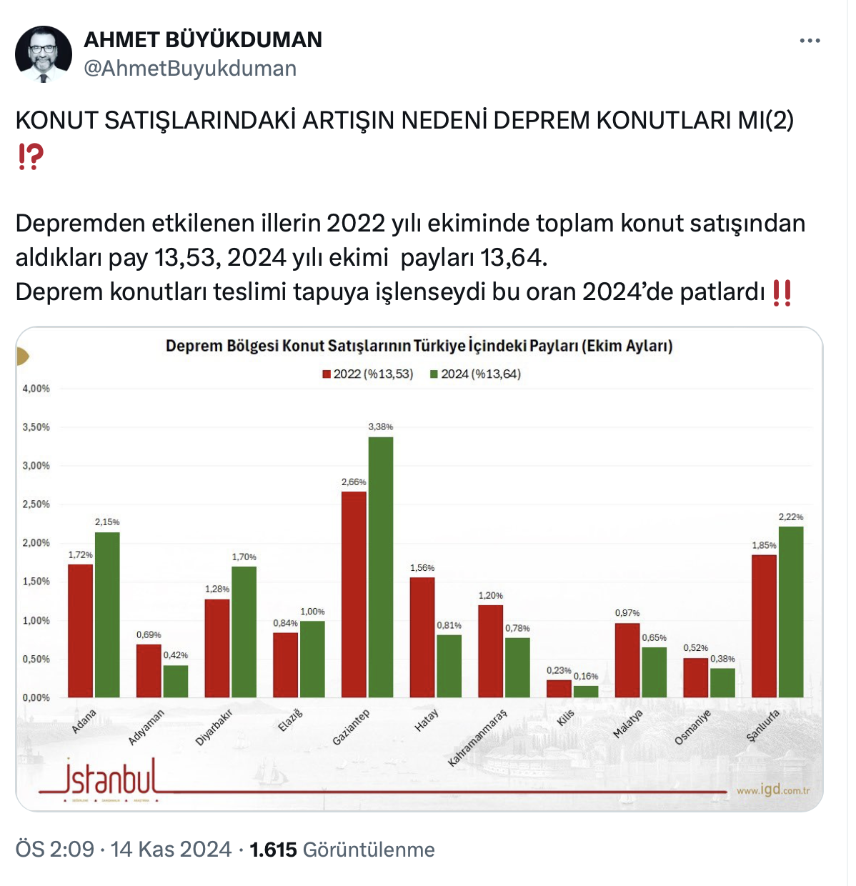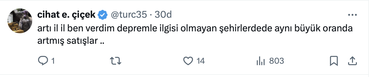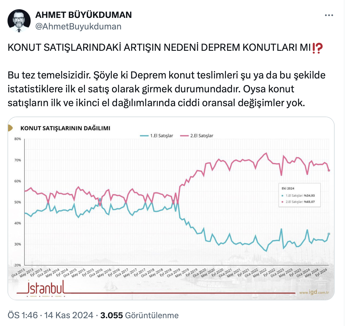 Dr. Ahmet Büyükduman paylaşımında deprem konutlarının teslimlerinin istatistiklere ilk el satış olarak girdiğini belirterek, oysa konut satışlarında ilk ve ikinci el dağılımlarında ciddi oransal değişimler olmadığını söyledi.