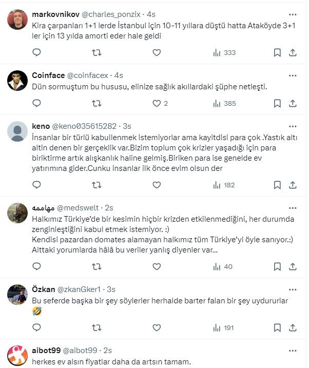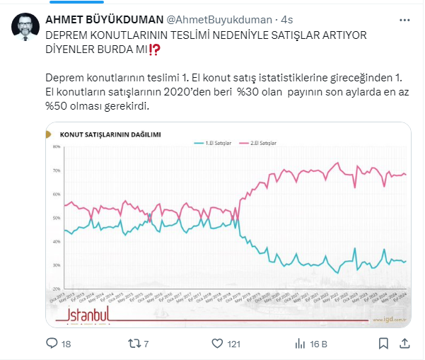 Gayrimenkul değerleme uzmanı Ahmet Büyükduman, sosyal medya hesabından rakamlardaki bu artışın 'deprem konutlarının teslim edilmesi' ile ilgili olup olmadığını sordu.
