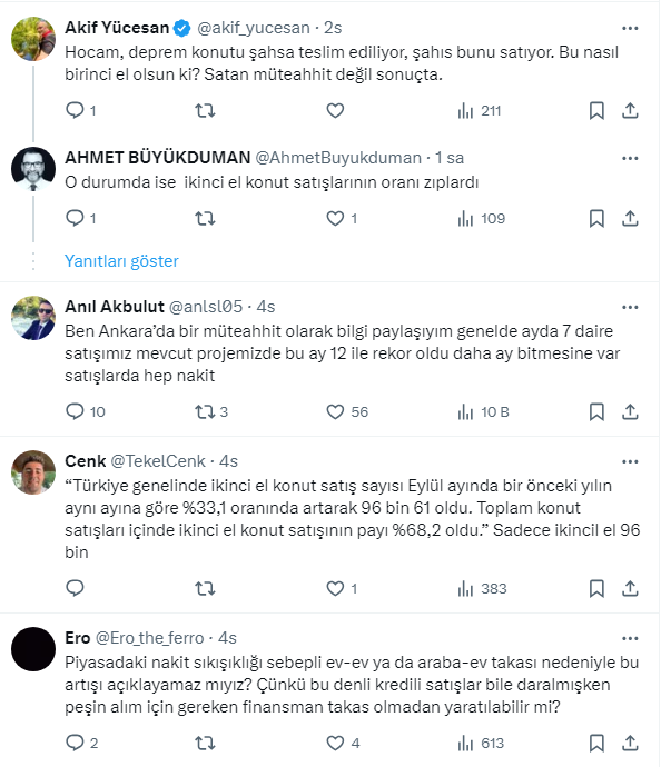 Büyükduman, takipçilerine 'deprem konutlarının teslimi nedeniyle satışlar artıyor diyenler burada mı?' diye soru yöneltti.