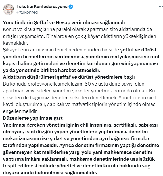 Şikayetlerin artmasındaki temel nedenlerden birinin şeffaf ve dürüst yönetim hizmetlerinin verilmemesi, olduğunu açıklayan Av. İbrahim Güllü, Tüketici Konfederasyonu sosyal medya hesabı X'ten konut site aidat fiyatları ve fiyatları artıran nedenleri açıkladı. İşte o paylaşım...