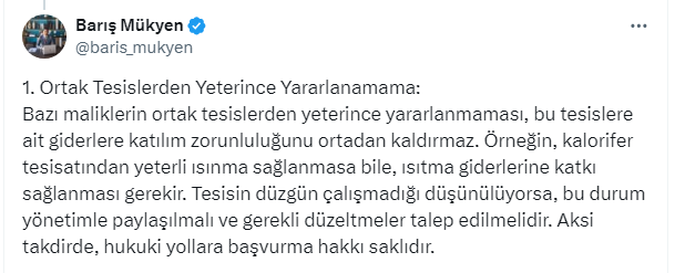 Bazı maliklerin ortak tesislerden yeterince yararlanmaması, bu tesislere ait giderlere katılım zorunluluğunu ortadan kaldırmaz. Örneğin, kalorifer tesisatından yeterli ısınma sağlanmasa bile, ısıtma giderlerine katkı sağlanması gerekir. Tesisin düzgün çalışmadığı düşünülüyorsa, bu durum yönetimle paylaşılmalı ve gerekli düzeltmeler talep edilmelidir. Aksi takdirde, hukuki yollara başvurma hakkı saklıdır.