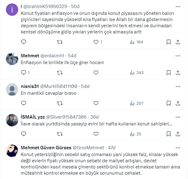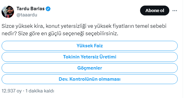Peki yaşana konut krizinini nedeni ne? Analist Tardu Barlas https://x.com/taaardu X sosyal medya hesabı üzerinden bir anket yayınlayarak konut yetersizliği ve fiyatların yüksek olmasının sebebini sordu.