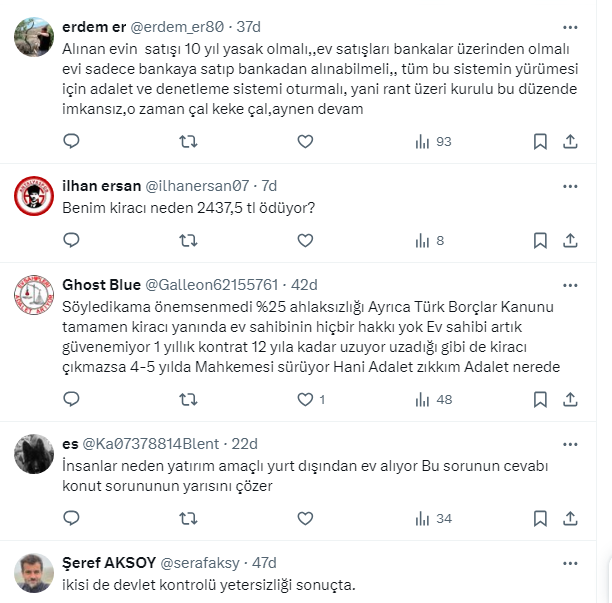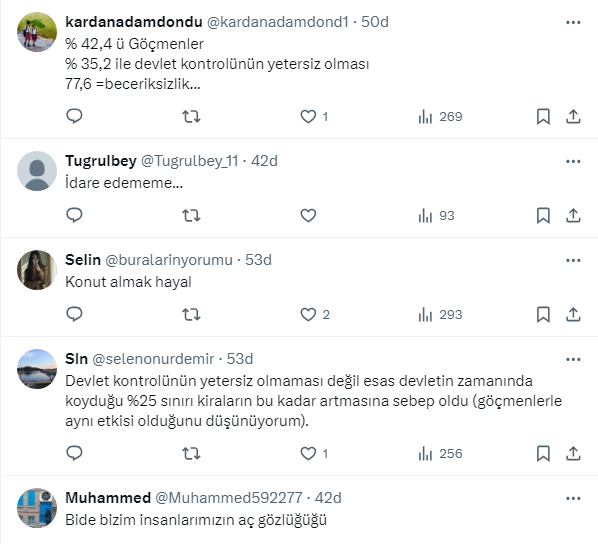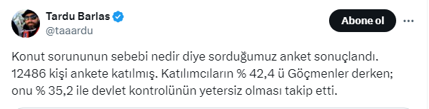Konut fiyatları ve kiralardaki artış devam ederken, çözüm için atılan adımlar yetersiz kalıyor. Analist Tardu Barlas, konut sorununun sebebini sorduğu bir anket hazırlayarak takipçilerine sordu. Yaklaşık 12 bin 500 kişinin katıldığı anketin sonuçlarına göre en önemli neden göçmenler.