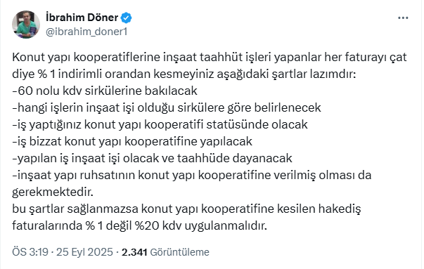 Mali Müşavir İbrahim Döner sosyal medya hesabı X'ten konut yapı kooperatiflerine inşaat taahhüt işleri yapanları uyardı. Döner: ''Her faturayı çat diye yüzde 1 indirimli orandan kesmeyiniz.'' diyerek şartları açıkladı.