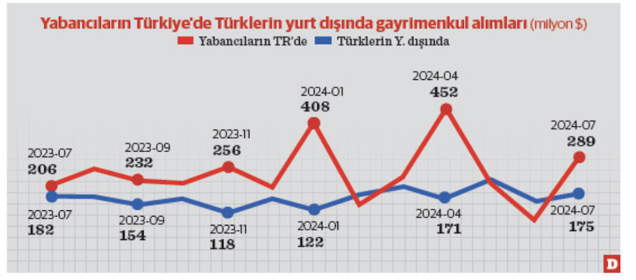 Yabancıların ülkemizden konut alımına ilgisinin giderek azaldığı, konut kredisi faizlerinin aşırı yükseldiği ve orta gelir grubunun alım gücünün düşmesi sebebiyle talebin baskılandığı, iç piyasanın giderek daraldığı söz konusu bu süreçte ülkemizde konut satışları da düşüşe geçti. Üst gelir grubunda yer alan yatırımcı tipi yerli alıcıların ilgisi de yurt dışına yöneldi. Söz konusu tüm bu gelişmelerle, başka ülkelerden konut alımı için yurt dışına transfer edilen dövizler yılın ilk yedi ayı itibarıyla 1,2 milyar doları geçti.