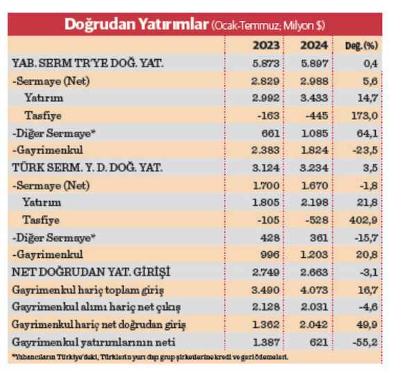 Yeni tesis kurma veya kurulu tesisleri satın almaya yönelik “sermaye” yatırımları cephesinde de bu sene ocak-temmuz döneminde 3 milyar 433 milyon dolarlık bir giriş yaşandı. Gayrimenkul alımlarının bir kerelik etkisine karşılık, üretim ve ihracat yaparak, istihdam yaratarak ekonomiye sürekli olarak katma değer sağlayan söz konusu yatırımlara yönelik girişler geçen senenin aynı dönemine göre yüzde 14,7 artış gösterdi. Fakat söz konusu bu dönemde yüzde 175 artış göstererek, 445 milyon dolara ulaşan tasfiyeler düşüldüğünde net doğrudan sermaye yatırım girişi yüzde 5,6 artışla 2 milyar 988 milyon dolar şeklinde oldu.