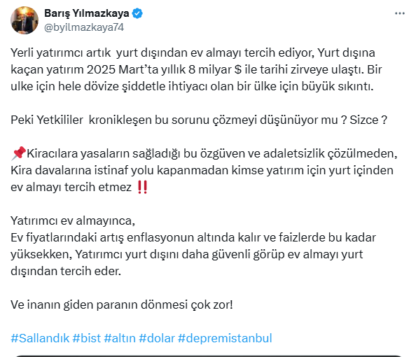 Yurt dışına kaçan yatırım 2025 Mart’ta yıllık 8 milyar dolar ile tarihi zirveye ulaştı. Yerli yatırımcılar, yurt dışından konut almaya devam ediyor. Ekonomist Barış Yılmazkaya, bu durumu değerlendirerek '' Bir ulke için hele dövize şiddetle ihtiyacı olan bir ülke için büyük sıkıntı.'' açıklamasını yaptı.