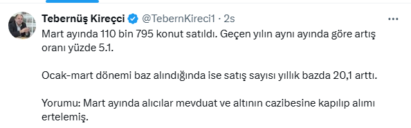 Sosyal medya hesabından TÜİK'in açıkladığı rakamları değerlendiren Türkiye'nin 1 numaralı emlak ve konut editörü Tebernüş Kireçci, ''Mart ayında alıcılar mevduat ve altının cazibesine kapılıp alımı ertelemiş.'' yorumunda bulundu.