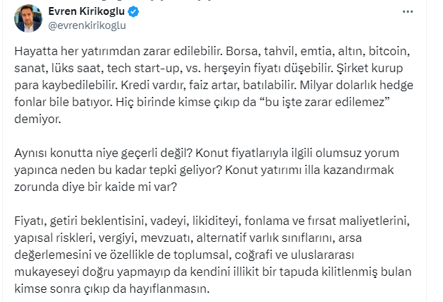 Yatırımcının yeniden konuta yönelirken, stratejist ve yatırım danışmanı Evren Kirikoğlu, konut alan herkesin mutlaka kazanç sağlayacağını düşündüğüne dikkat çekerek,” Konut yatırımı illa kazandırmak zorunda diye bir kaide mi var?” diye sordu. Kirikoğlu https://x.com/evrenkirikoglu X sosyal medya hesabından yaptığı paylaşımda, konut yatırımında da kaybetme riskinin olduğunu söyledi. Kirikoğlu paylaşımda şunları söyledi: