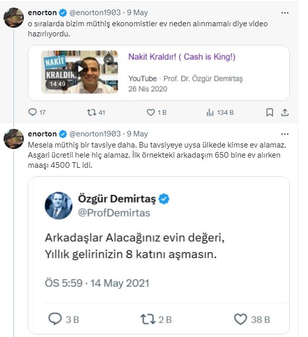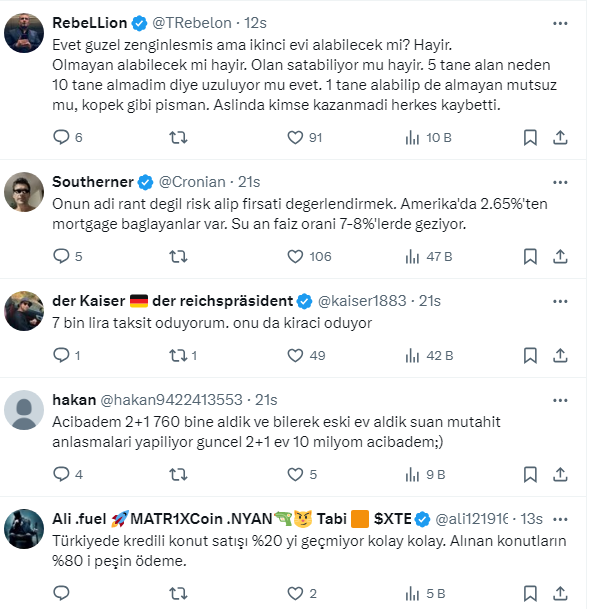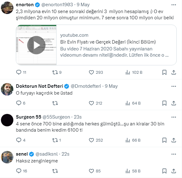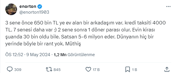 Konut fiyatları yükselmeye devam ediyor. Kira bedellerinde ise artış hız kesmiyor. Yatırımcılar tarafından en güvenli liman olarak görülen konut yatırımı yıllar içinde yatırımcılarına büyük kazanç sağladı. Buna bir örnek sosyal medya hesabı X kullancılarından 3.149 takipçili enorton adındaki kişiden geldi. Arkadaşının üç sene önce 650 bin liraa aldığı evin kredi ödemesinin 4000 lira olduğunu söyleyerek şu anda evin değerinin 6 milyon liraya kirasının ise 30 bin lira olduğunu belirtti. Paylaşımının altına adeta yorum yağmuru geldi. İşte o paylaşım ve vatandaşlardan gelen yüzlerce o yorumlar....