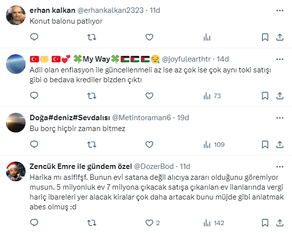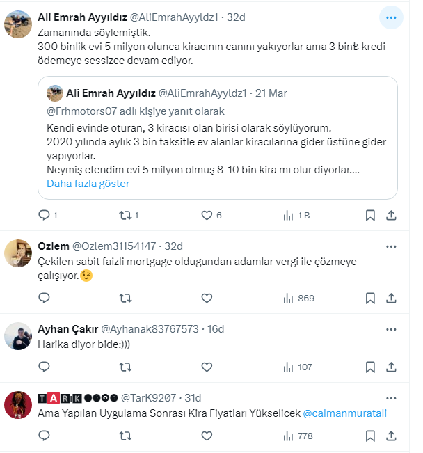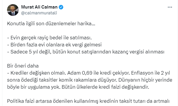 Konut piyasasında yeni düzenlemelerin getirileceğine dair haberler gündeme gelmeye başladı. Bunlardan en önemlileri arasında; evin rayiç bedelle satılması ve birden fazla evi olanlara ek vergi getitilmesi gibi maddeler yer alıyor. Kripto fenomeni Murat Ali Calman, söz konusu yeni düzenlemeler ile ilgili değerlendirme yaptı. Calman bu düzenlemelerin çok doğru olduğunu belirterek bir tavsiyede bulundu. Calman kredilerin de değişken olması konusunda öneride bulundu. Bunu şekilde açıkladı, 0,66 kredi çeken birinin enflasyon ile 2 yıl sonra ödediği taksitlerin komik rakamlara düştüğünü belirterek, dünyada böyle bir uygulamanın olmadığını söyledi. İşte Calman'ın sosyal medya hesabı X'ten yaptığı o paylaşım ve gelen yorumlar...