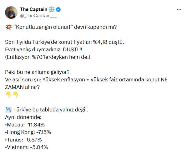 The Steve Group Bilişim A.Ş'nin kurucusu, The Captain ''Yani sadece bizde değil, yüksek faiz politikasına geçen her ülkede konut fiyatları geriliyor.'2 dedi ve nedenlerini sosyal medya hesabından açıkladı. İşte ayrıntılar...