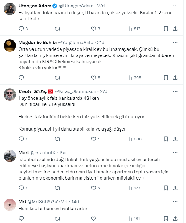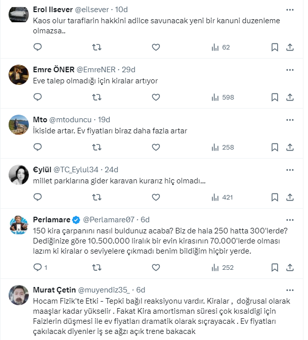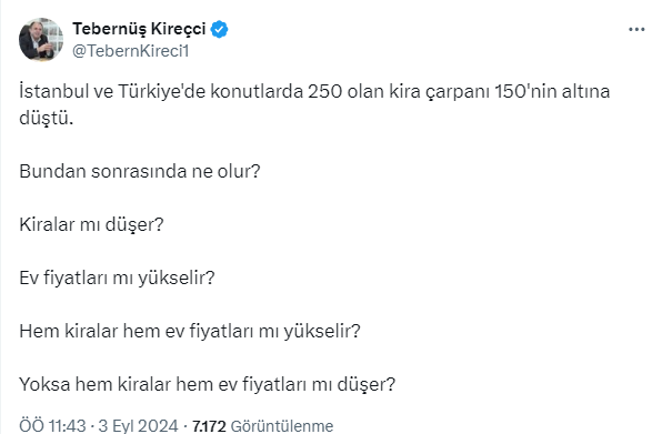 Kira artış oranının belli olmasının ardından Türkiye'nin 1 numaralı emlak ve konut editörü Tebernüş Kireçci, İstanbul ve Türkiye'deki kira çarpanlarına değindi. Ülke genelinde kira çarpanının 250'de 150'ye indiğini aktaran Kireçci sosyal medya hesabı X'ten takipçilerine sordu: Bundan sonrasında ne olur? Kiralar mı düşer? Ev fiyatları mı yükselir? İşte Kireçci'nin o paylaşımı ve takipçilerden gelen cevaplar...