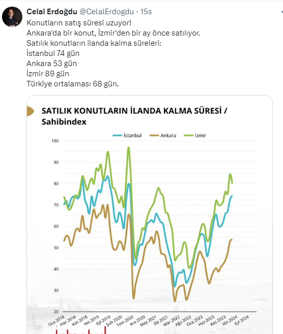Şehir Plancısı ve Gayrimenkul Değerleme Uzmanı Celal Erdoğdu resmi sosyal medya hesabı üzerinden konutların satış sürelerinin uzadığını söyleyerek, il il ilanların yayında kalma sürelerini hesapladı.