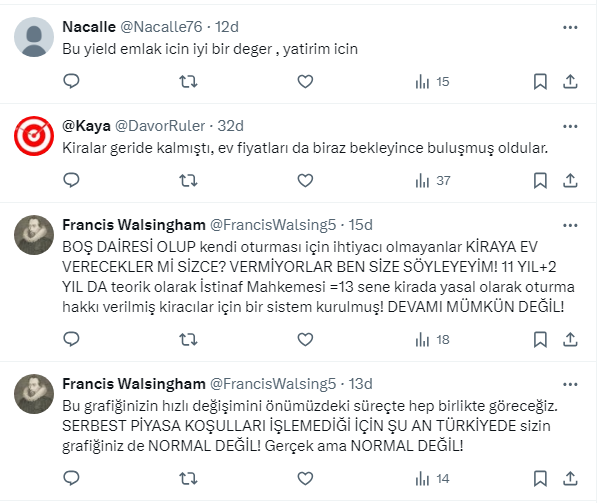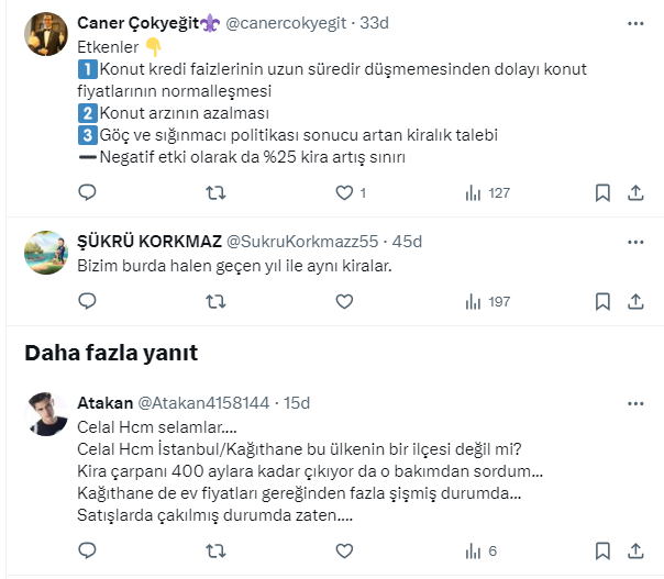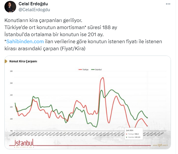 Şehir Plancısı ve Gayrimenkul Değerleme Uzmanı Celal Erdoğdu https://twitter.com/CelalErdogdu X sosyal medya hesabından yaptığı paylaşımda, konutların kira çarpanlarının gerilediğini belirterek, Türkiye ve İstanbul için kısalan amortisman sürelerini açıkladı.Türkiye'de ortalama bir konutun amortisman süresinin 188 ay, İstanbul'da ortalama bir konutun ise 201 ay olduğunu belirtti. Sahibinden.com ilan verilerine göre yapılan hesaba göre Türkiye geneli 15 yıl6 ay İstanbul içinse amortisman süresi 16 yıl 7,5 ay.