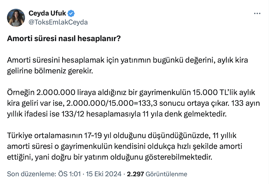 Gayrimenkul Değerleme Uzmanı Ceyda Ufuk resmi sosyal medya hesabı https://x.com/ToksEmlakCeyda üzerinden yaptığı paylaşımda amortisman süresinin nasıl hesaplanacağını anlattı.