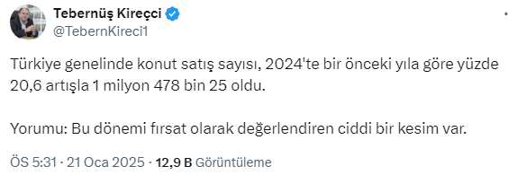 Türkiye'nin 1 numaralı emlak ve konut editörü Tebernüş Kireçci, açıklanan konut satış rakamlarını değerlendirerek, bu dönemi fırsat olarak değerlendiren ciddi bir kesim olduğunu söyledi.