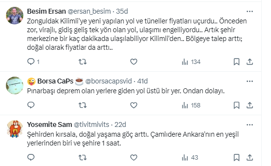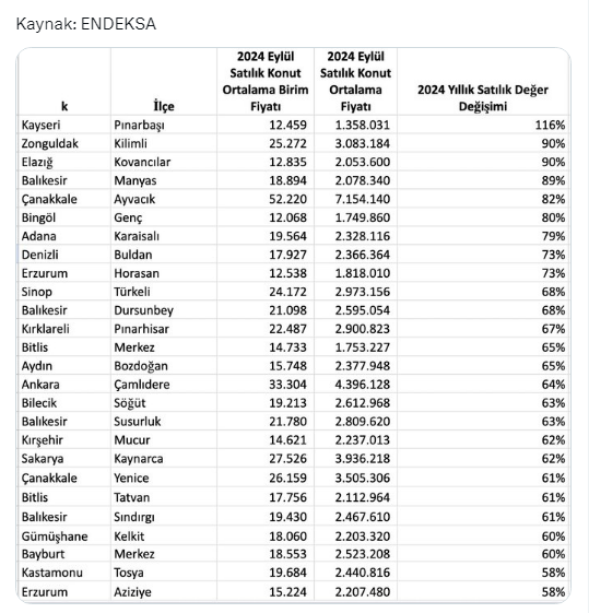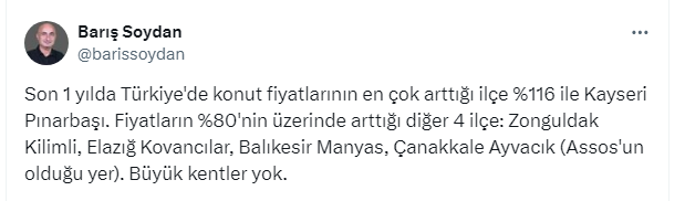 “Son 1 yılda Türkiye'de konut fiyatlarının en çok arttığı ilçe yüzde 116 ile Kayseri Pınarbaşı. Fiyatların yüzde 80'nin üzerinde arttığı diğer 4 ilçe: Zonguldak Kilimli, Elazığ Kovancılar, Balıkesir Manyas, Çanakkale Ayvacık (Assos'un olduğu yer). Büyük kentler yok.”