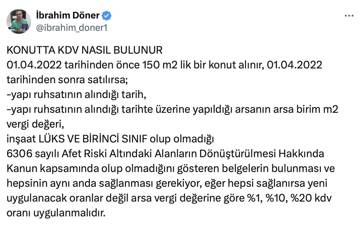 Pek çok kişi konutta KDV’nin nasıl bulunacağı ile ilgili araştırmalar yaparken, Mali Müşavir İbrahim Döner resmi sosyal medya hesabı https://x.com/ibrahim_doner1 üzerinden konutta KDV hesaplaması ile ilgili bir paylaşım yaptı.