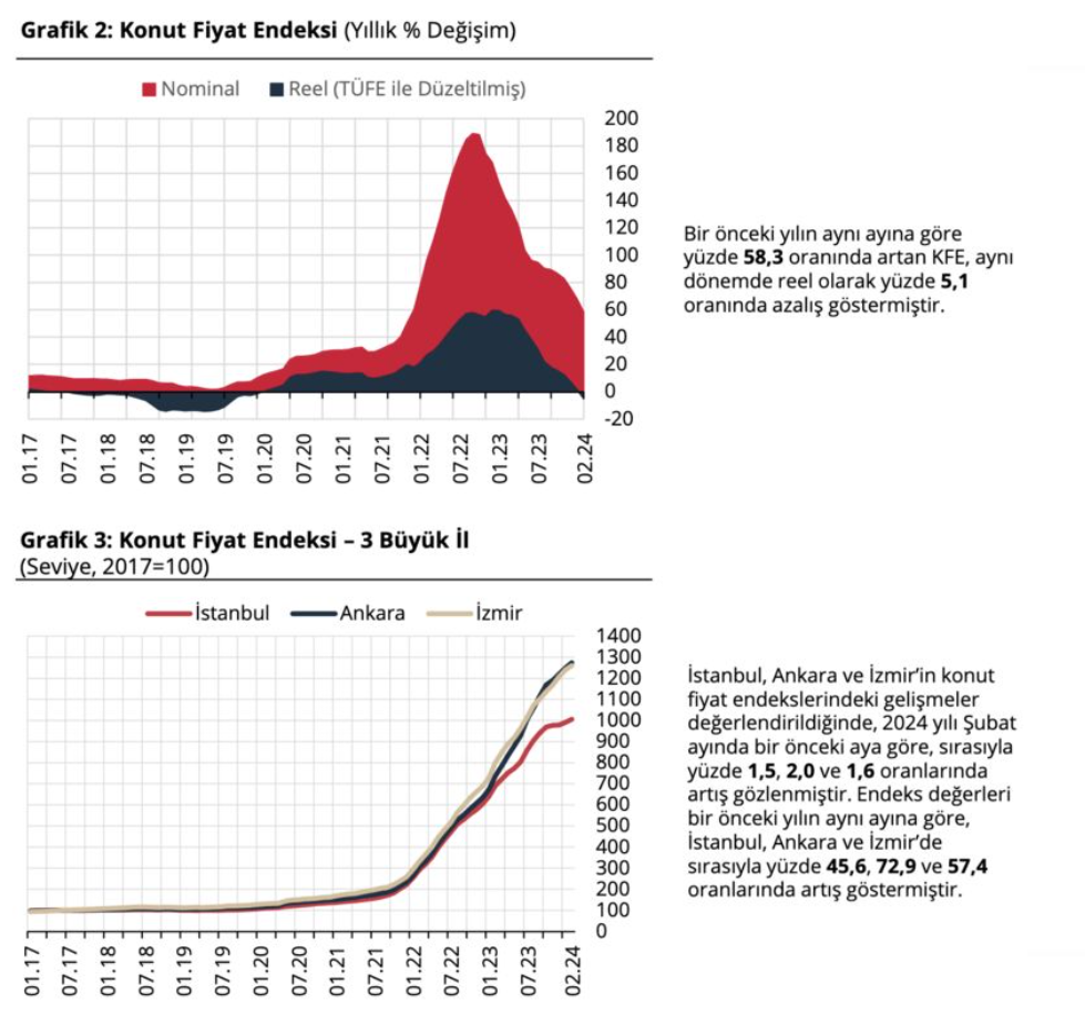 2024 yılının Şubat ayında konut fiyatları yüzde 2.2 artış gösterirken, yıllık fiyat artışı 10 puanlık gerileme gösterdi ve yüzde 58’e indi. Enflasyon da Şubat ayında aylık yüzde 4.53 ve yıllık ise yüzde 67.07 ile konut fiyatlarını adeta geride bıraktı.