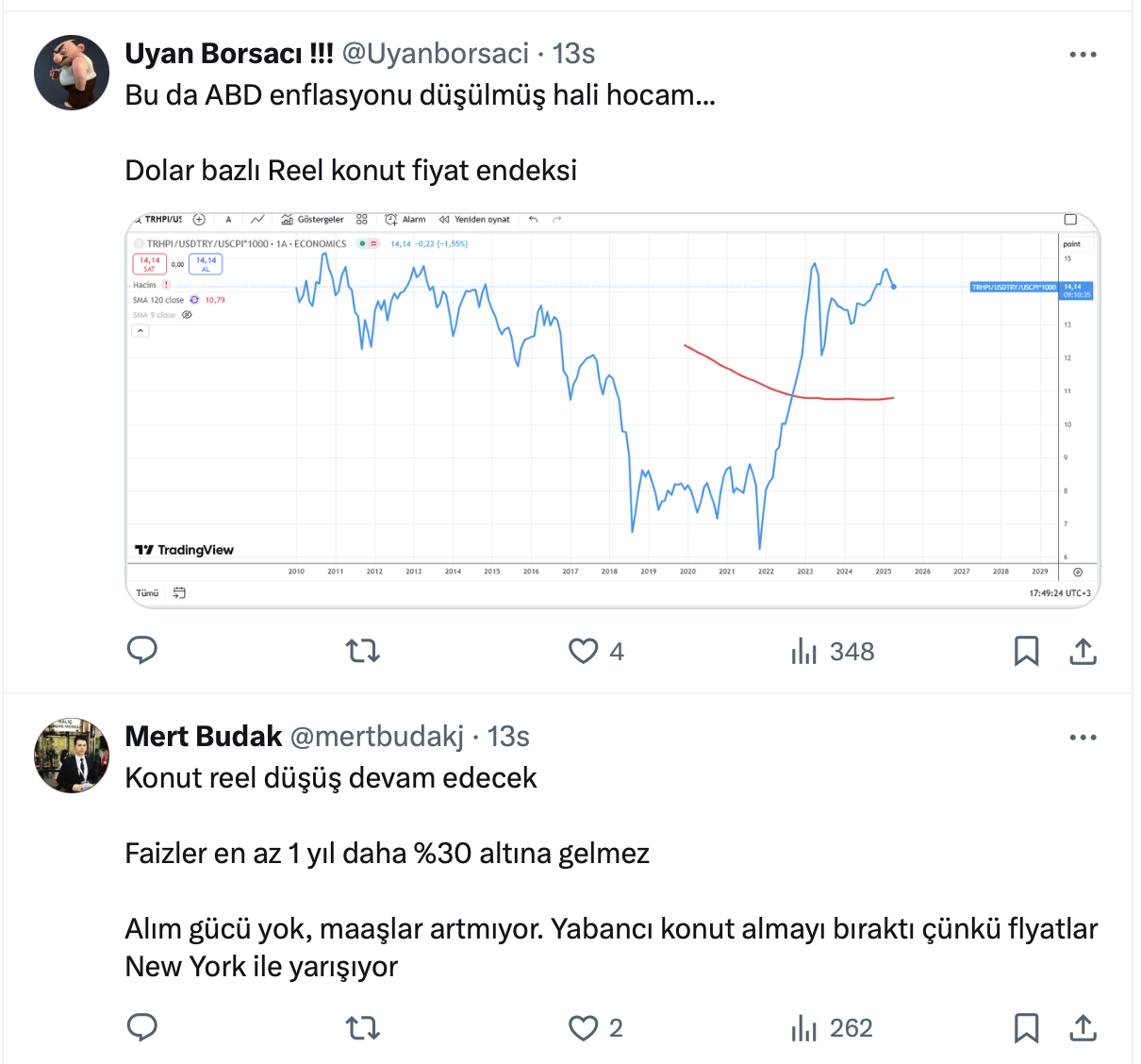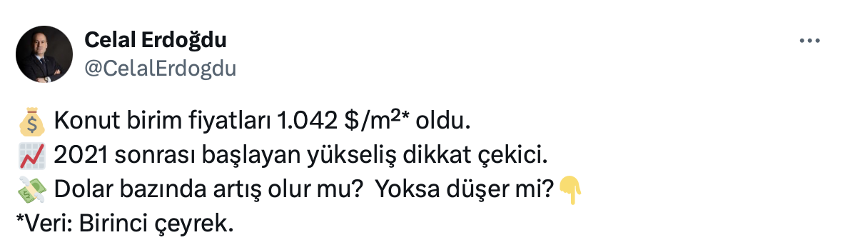 Konut fiyatlarında yaşanan değişimler son günlerin en çok konuşulan konuları arasında yer alırken, Şehir Plancısı ve Gayrimenkul Değerleme Uzmanı Celal Erdoğdu da resmi X hesabı https://twitter.com/CelalErdogdu üzerinden konu ile ilgili yeni bir paylaşım yapıt.