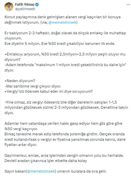 Yılmaz, vatandaşlara verilen hakkın emlakçılar tarafından gasp edildiğini hem de vergi kaçırıldığını söyleyerek sosyal medya hesabı X'ten Hazine Bakanı Mehmet Şimşek'e seslendi. İşte o paylaşım ve gelen yorumlar....