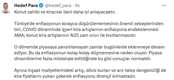Endüstri Mühendisi ve Gayrimenkul Yatırımcısı Hedef Para sosyal medya hesabı üzerinden konut piyasasındaki fahiş fiyat artışa değinerek, yüzde 25 kira zam sınırlamasının faturasının kesilmeye başladığını açıkladı.