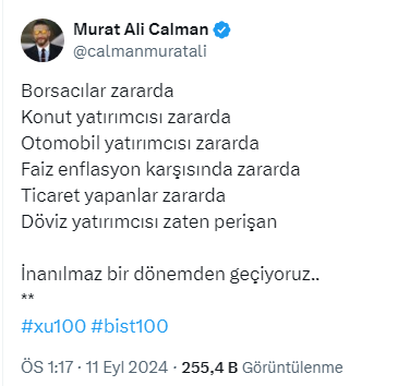 Analist ve kripto fenomeni Murat Ali Calman, yatırımcıların hepsinin zarar ettiğini açıklayarak 'inanılmaz bir dönemden geöçiyoruz' yorumu yaptı. Calman'ın paylaşımı sosyal medyadan büyük ilgi gördü. Paylaşımı gçren takipçiler ise 'kim kazandı?' diye sordu. İşte Calman'ın sosyal meyda hesbı X'ten yaptığı o paylaşım ve gelen yorumlar...