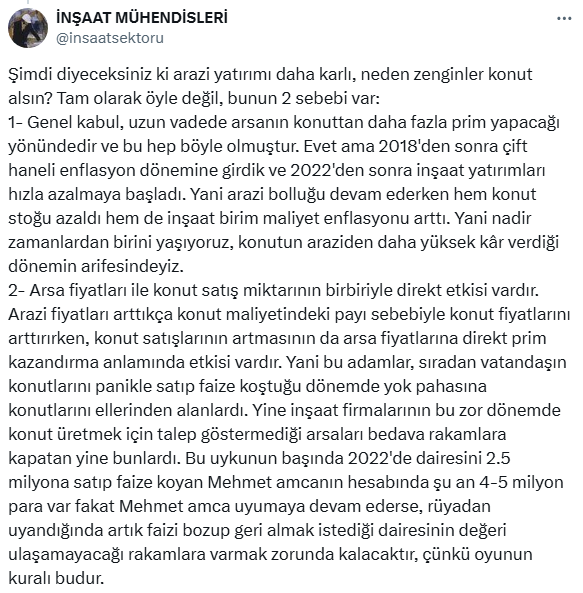 İnşaat piyasasına dair paylaşımları ile dikkatleri üzerine çeken, İnşaat Mühendisleri, sosyal medya hesabı X'ten arsa ve konut yatırımıyla ilgili yatırımcıların bilmesi gerekenleri açıkladı. Yatırımcıların neden arsa ve konut alması gerektiğini 2 nedenle açıklayan İnşaat Mühendisleri, yatırımcıları yatırım yaparken uyarıyor.