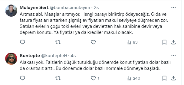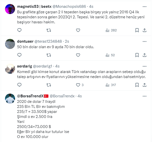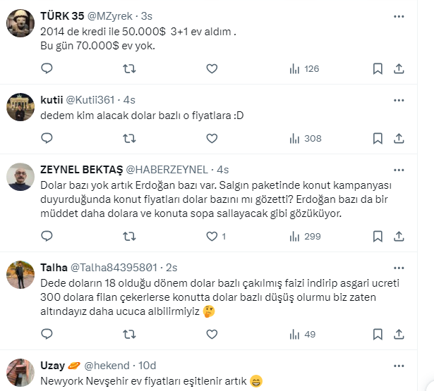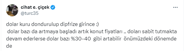 Yaşanan bu gelişmeler çerçevesinde 171 bin takipçili yatırım danışmanı Cihat Çiçek, https://x.com/turc35 X sosyal medya hesabından yaptığı paylaşımda, kurun sabit tutulması halinde konut fiyatlarının önümüzdeki günlerde dolar bazlı yüzde 30-40 artabileceğini söyledi.
