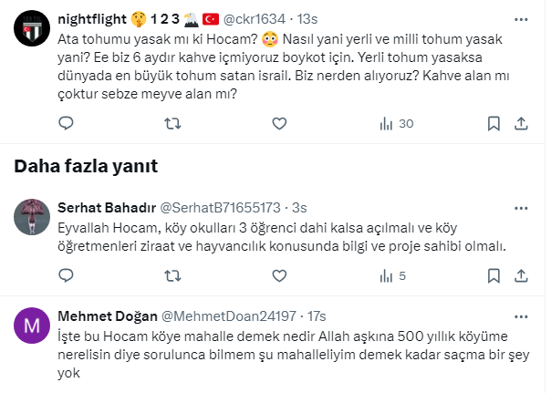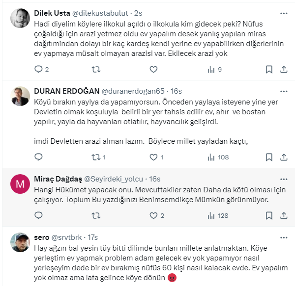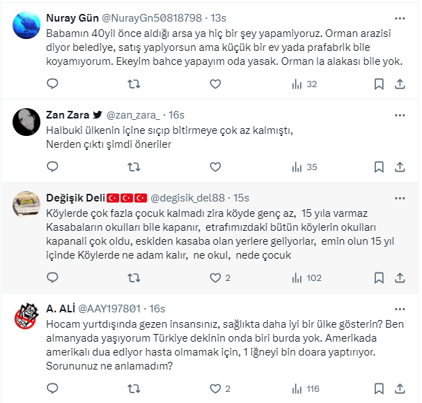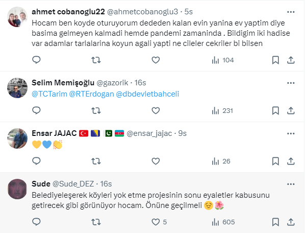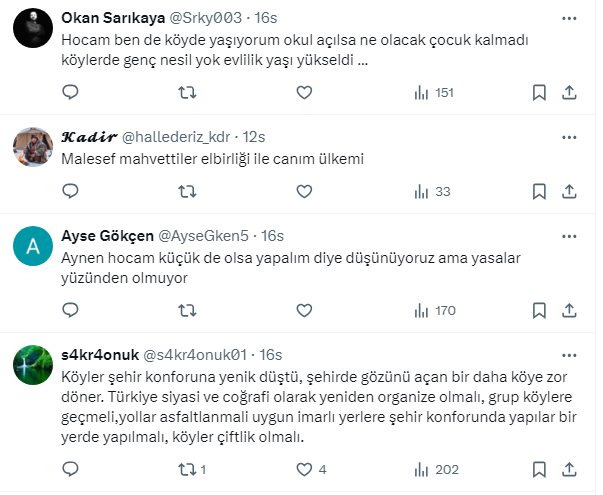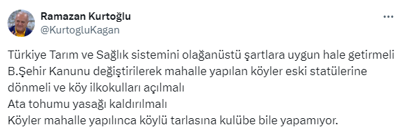 İstanbul Aydın Üniversitesi Öğretim Üyesi olan Ekonomist Ramazan Kurtoğlu, https://twitter.com/KurtogluKagan X sosyal medya hesabından yaptığı paylaşımda, Türkiye’de tarım ve sağlık sistemininin olağanüstü şartlara uygun hale getirmesi gerektiğini söyleyerek, Büyük Şehir Kanunu değiştirilerek mahalle yapılan köyler eski statülerine dönmeli ve köy ilkokulları açılmalı, ata tohumu yasağı kaldırılmalı, köyler mahalle yapılınca köylü tarlasına kulübe bile yapamıyor” dedi. Kurtoğlu’nun takipçileri de ona destek verdi.