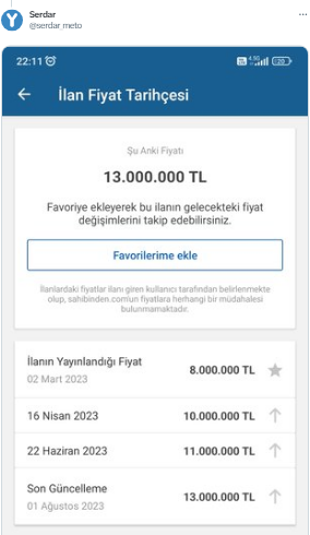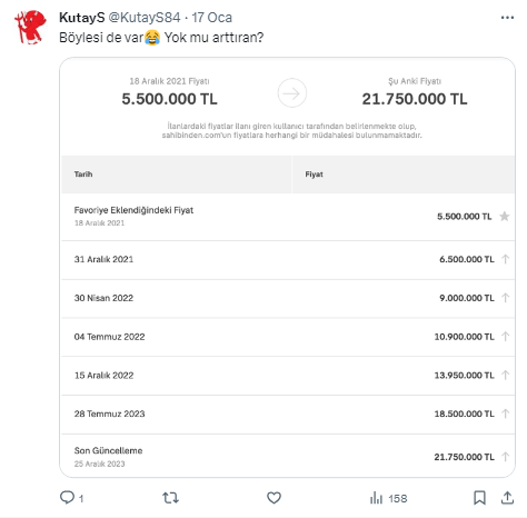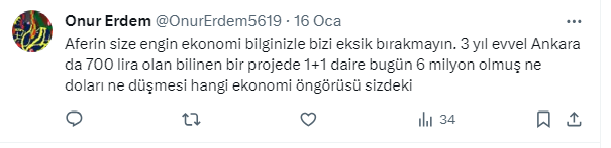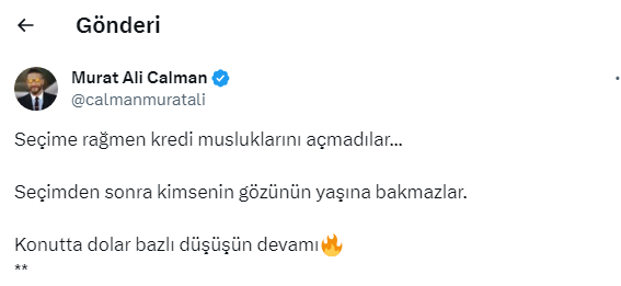 Seçimlere rağmen kredi musluklarının açılmadığını belirten kripto fenomeni Murat Ali Calman, twitter.com/calmanmuratali X sosyal medya hesabından yaptığı paylaşımda konut fiyatlarında dolar bazlı olarak düşeceğini söyledi. Bir ilan sitesinde 27 Aralık 2024’te 6 milyon 375 bin TL olan ev fiyatının 16 Ocak itibariyle 5800 TL’ye düşmesini de örnek olarak gösterdi.