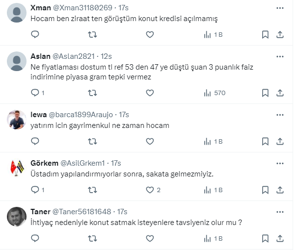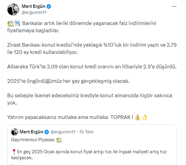 Daha önceki paylaşımlarında “Önümüzdeki 3-4 ay içerisinde sıkı pazarlık ve yüksek gözüken oranlara rağmen kredi ile ikamet edeceğim konutu alırım. İkamet edeceksem ince hesap yapmam,kim ne demiş bakmam” tavsiyesinde bulunmuştu. Mert Ergün bu defa da oturmak için ev alacaklara kredi ile konut satın almalarını önerirken, yatırımcılara ise mutlaka toprak almalarını söyledi.