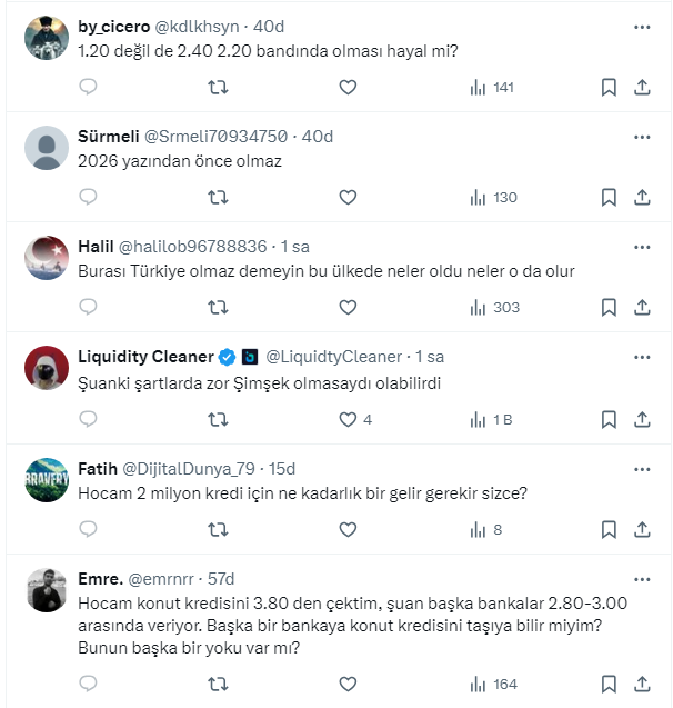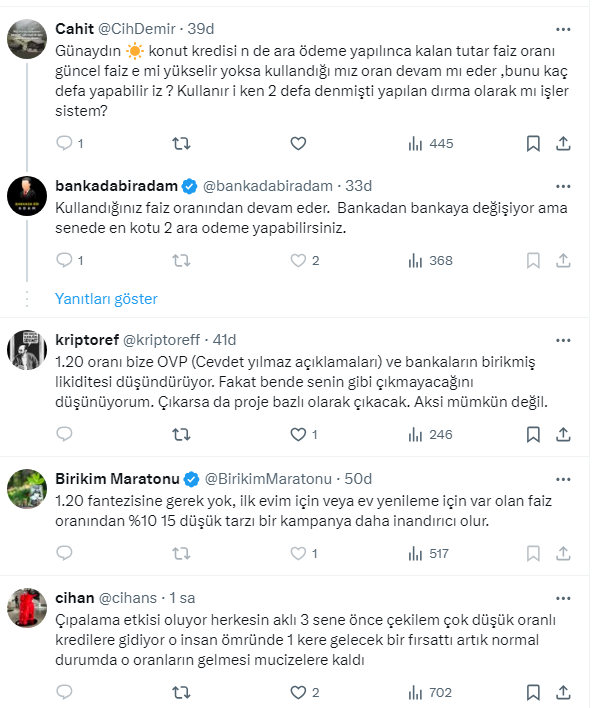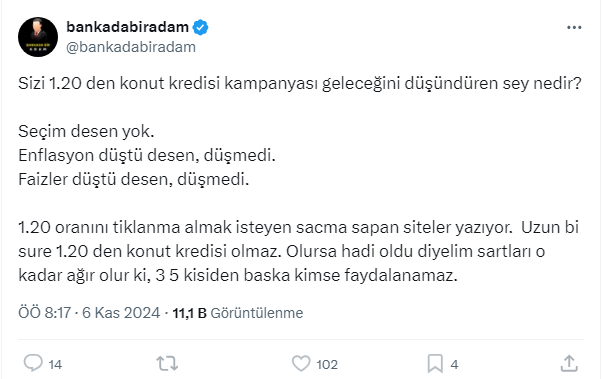 Milyonlarca kişi 1,20 konut kredisi faiz oranlarıyla ilgili gelişmeleri takip ederken çarpıcı açıklama geldi. Bankadabiradam, sosyal medya hesabı X'ten ''1.20 den konut kredisi kampanyası geleceğini düşündüren sey nedir?'' sorusunun yanıtını verdi.