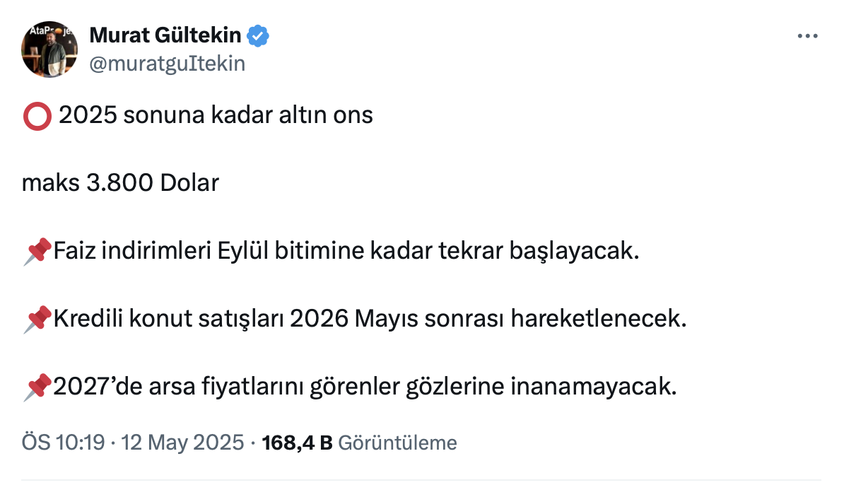 Gayrimenkul Uzmanı Murat Gültekin’in paylaşımı şu şekilde: