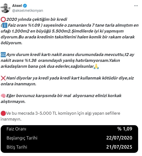 Kuyumcu, Girişimci Aksel Melkonyan, sosyal medya hesabından arsa almak isteyenleri uyardı. Arsa almak isteyip de parası olmayan yatırımcıların kredi çekerek arsa alınıp alınmayacağı konusunda açıklama yaptı. Aksel, kredi ile arsa almak isteyenler için bir örnek verdi.