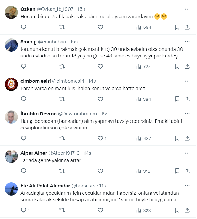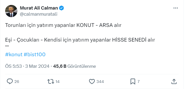Kripto fenomeni Murat Ali Calman resmi X hesabı https://twitter.com/calmanmuratali üzerinden yaptığı paylaşımda Torunları için yatırım yapanların konut-arsa, eşi, kendisi ve çocukları için yatırım yapanların da hisse senedi aldığını söyledi.