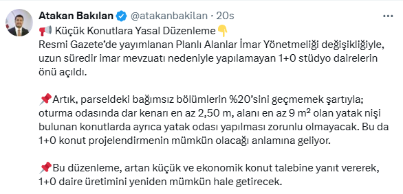 İnşaat Mühendisi Atakan Bakılan, sosyal medya hesabından, küçük konutlarla ilgili Resmi Gazete’de yayımlanan Planlı Alanlar İmar Yönetmeliği değişikliğini paylaştı. Yeni düzenleme ile birlikte imar mevzuatı nedeniyle yapılamayan 1+0 stüdyo dairelerin önü açılmış olacak.