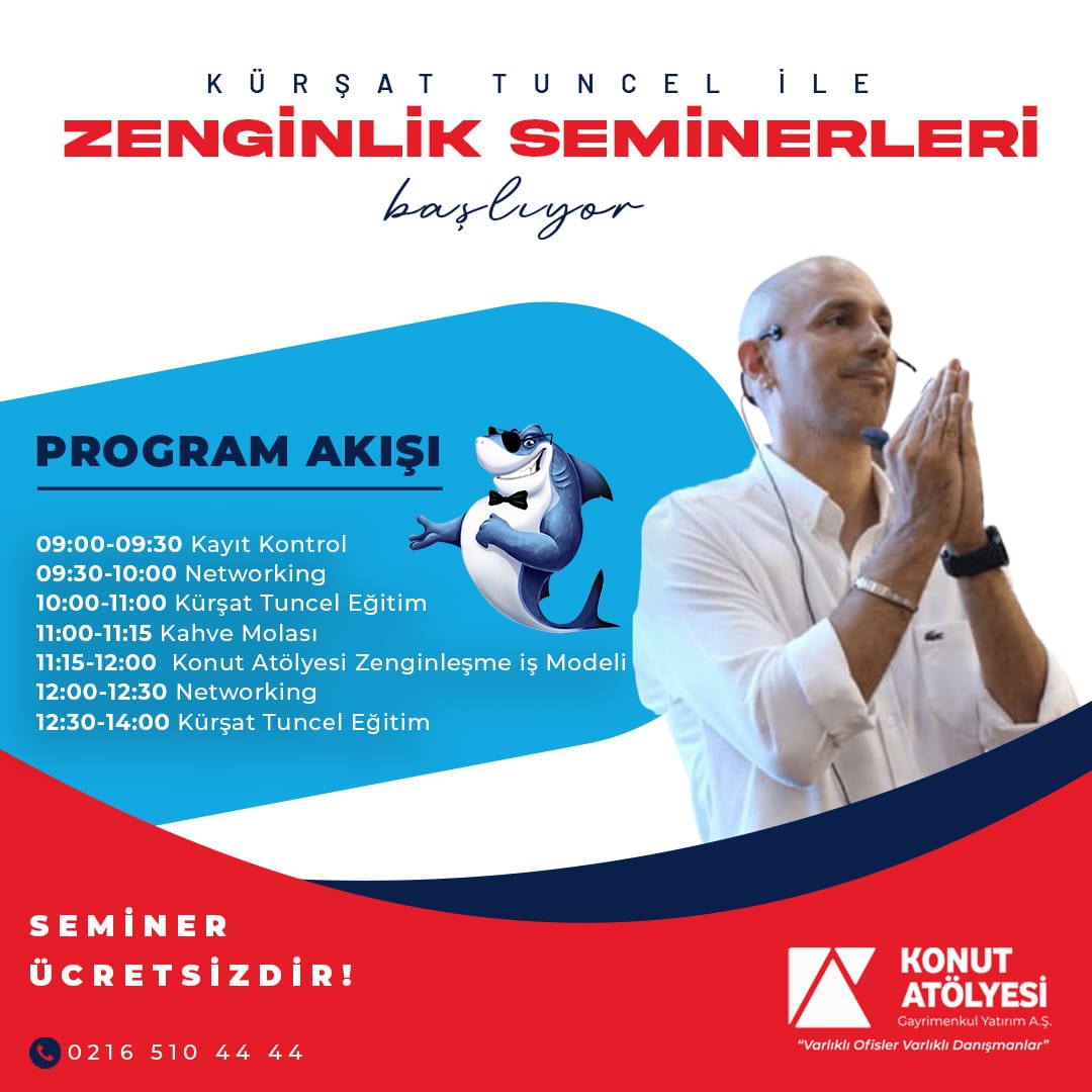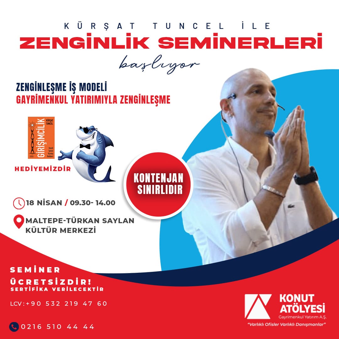 'Kürşat Tuncel ile Zenginlik Seminerleri' ücretsiz olup, kontenjanla sınırlıdır öncesinde kayıt oluşturulması gerekiyor. Kayıtlar için tıklayın...